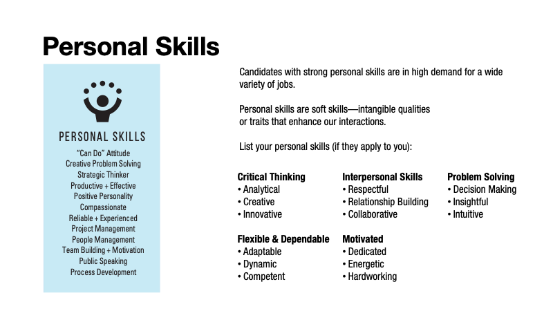 5. Personal Skills: Think about the qualities that you have and what you might have learned on the job. If you can’t think of these, you can do a web search for help. For example: If you were a cashier, type in “what skills are required for a cashier” and the return results are—math skills, running a POS (point of sale) system. communication skills, multi-tasking, product knowledge, dependability, customer service, complaints, etc.