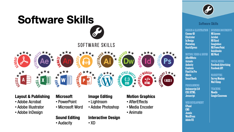 4. Software Skills: List ALL of the software that you have used, both in writing papers to graphic design software. When you start to learn many programs it is best to put them under categories so that it is easy to read. Sometimes HR managers don’t know all the software programs. Software you should have on your resume are: Illustrator, InDesign, Photoshop, PowerPoint, Acrobat, Animate, Media Encoder, Light Room—if you have taken Motion Graphics: Audacity, AfterEffects, Bridge, etc. You can rate your strength on these if you want in a chart, bar graph or simple rating scale. That will tell the employer which programs you have the most experience with (be realistic on this one).