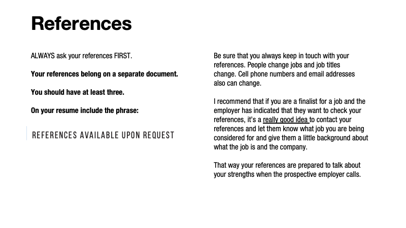 7. Put the sentence at the bottom of your resume that states: REFERENCE AVAILABLE UPON REQUEST.